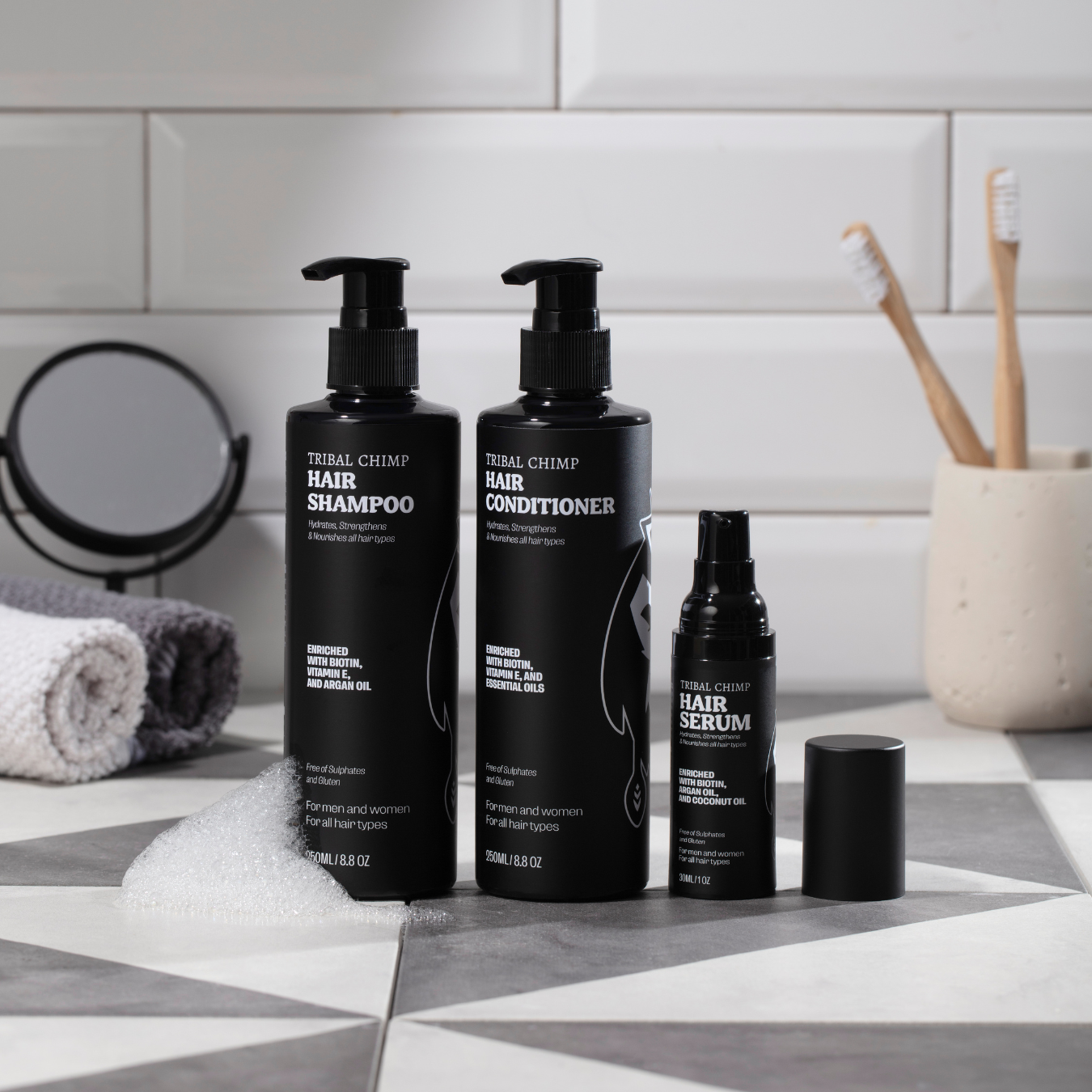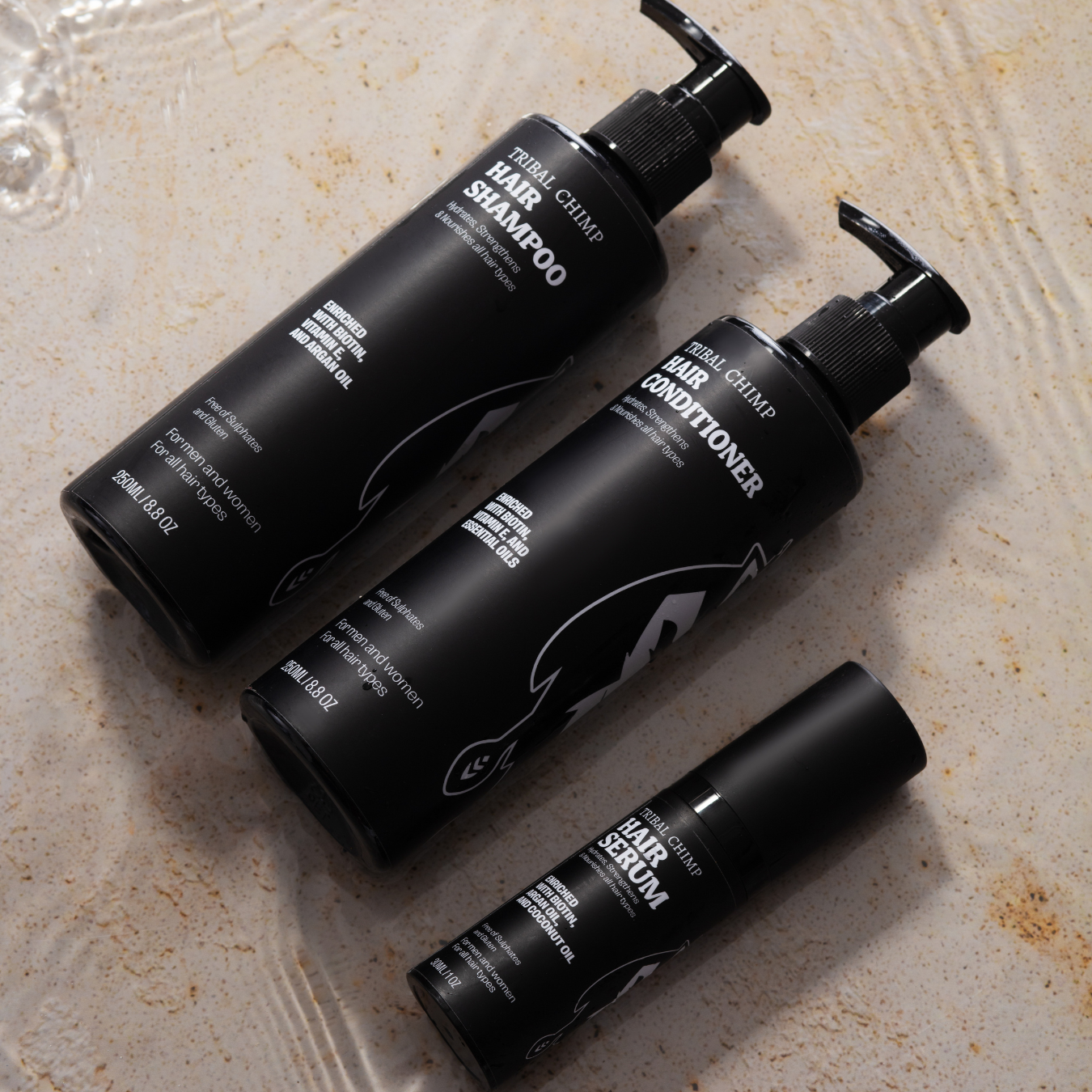 The Tribal Chimp Hair Care Kit is a complete regimen designed for healthier, stronger hair. With the Repair Shampoo, Nourish Conditioner, and Strengthen Serum, your hair will feel more vibrant, smoother, and easier to manage.